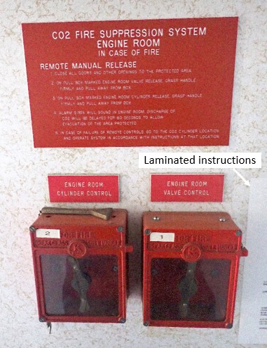 According to the applicable regulations, for vessels that are fitted with a CO2 fixed fire suppression system, “instructions on operating the smothering installation shall be displayed near the distribution control valves and also near the gas cylinders.”Footnote 17
