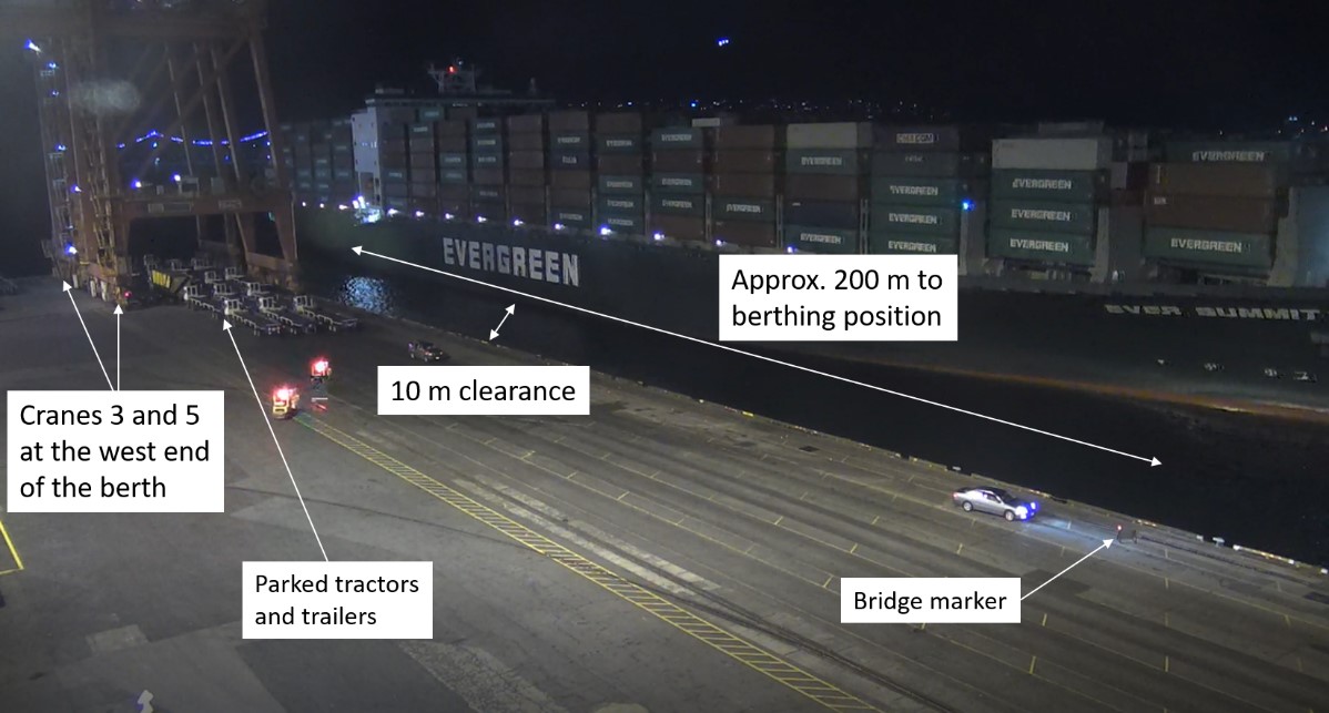 The pilot and tugs were all using VHF channel 17 for communications. At approximately 0343, after experiencing some disturbance on this channel, they switched over to another working channel. At this time, the Ever Summit was approaching the berth on a course that was nearly parallel to it and approximately 10 m off (Figure 4).