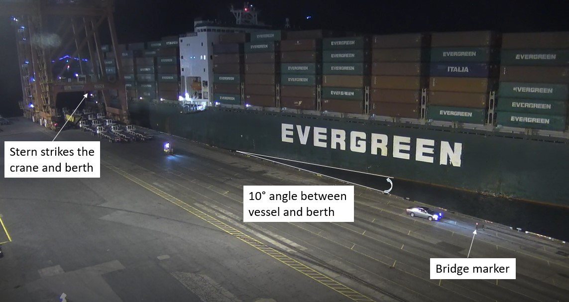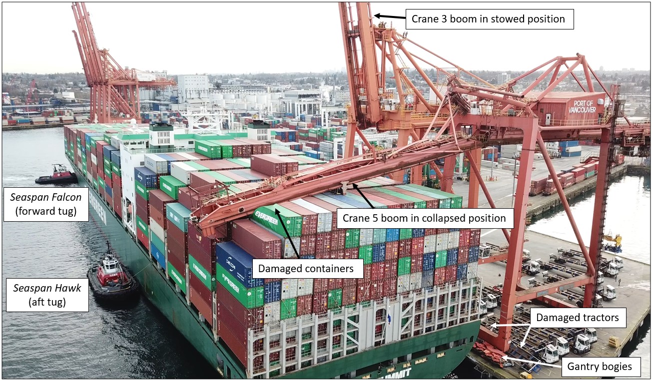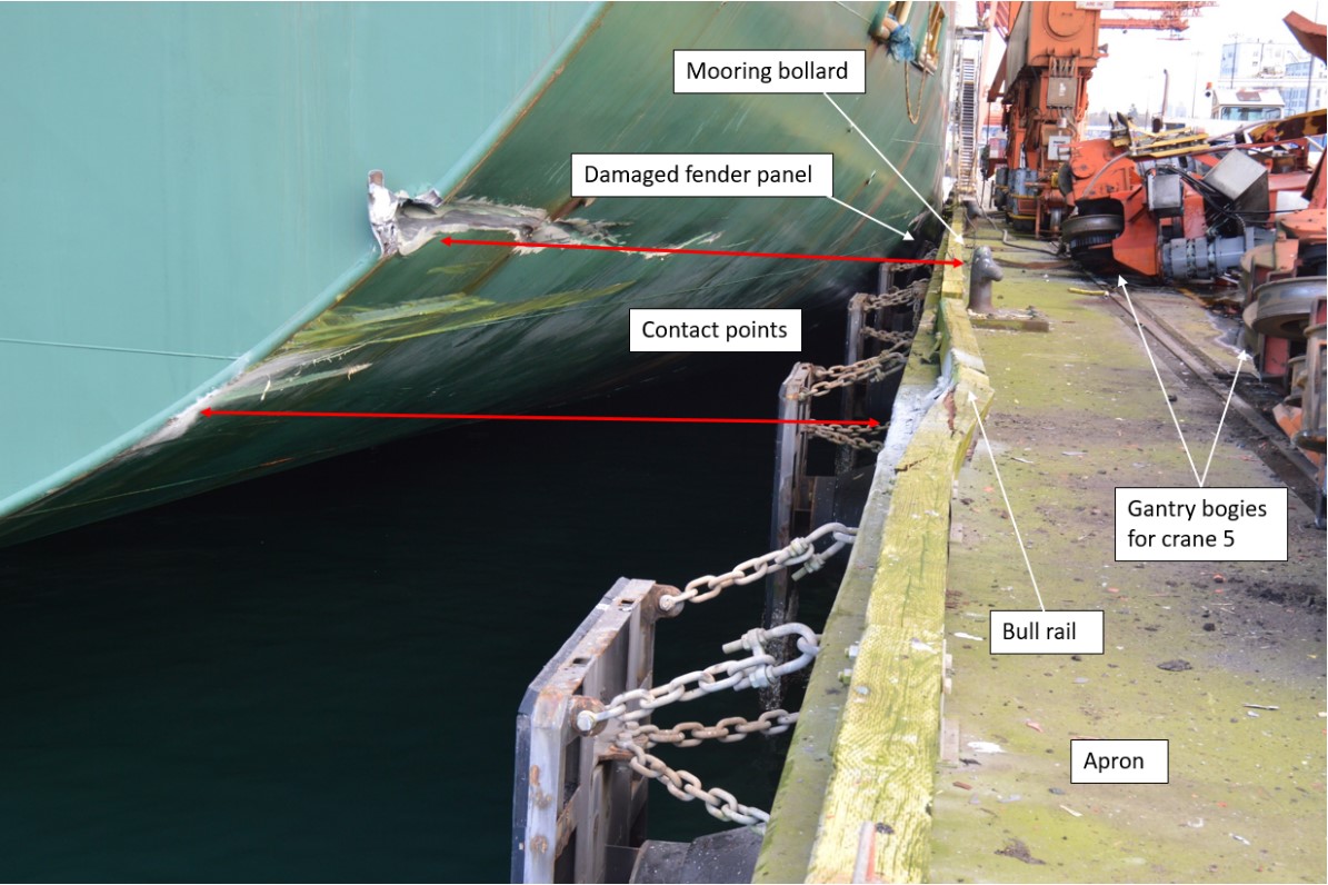 - The vessel’s large overhang and the proximity of the crane to the berth line resulted in the vessel’s hull striking the berth and the crane, which caused the crane’s gantry bogies to collapse and the boom to fall onto the vessel.