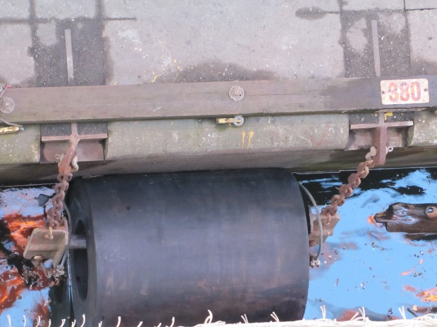 As part of an upgrade in 1990, berths 5 and 6 were fitted with hollow rubber cylindrical fenders (Figure 8). The fenders are 120 cm in external diameter and 150 cm long. They are draped along the side of the berths at 18.3 m intervals. Each fender hangs on a steel bar that is anchored to the berth with chains. The energy absorption capacity of the fenders is rated at 243 kilonewton metres (kN-m).