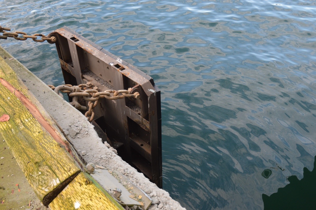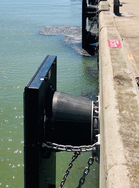 The cylindrical fenders do not have a means of reducing sliding friction. Large friction forces can develop as the rubber fender is compressed between the vessel hull and the concrete berth face, resulting in damage to the anchoring chains or plates. The fenders are known to the pilots as being “sticky,” meaning that the vessel’s hull does not slide easily along the fenders, but rather “sticks” on them, which can make berthing more difficult.