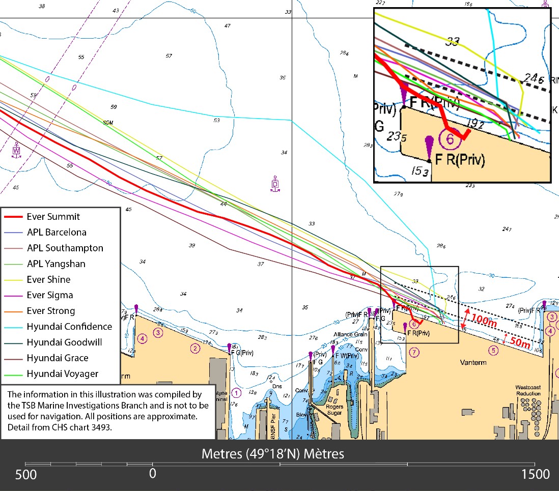 The report on the TSB simulation analysis of berthing conditions at Vanterm identified that a vessel of the Ever Summit’s size and design approaching the berth at Vanterm at an angle greater than 3° can result in the vessel contacting the berth, its fittings, or shore cranes, particularly at high tide. The investigation also determined that the energy absorption capacity of the fendering systems, the clearance between the waterside crane rail and the berth line posed hazards. These factors, as well as the suitability and location of mooring bollards and vessel spacing at the berth, need to be carefully evaluated, particularly in light of the greater displacements, length overall, and higher freeboards of large container vessels.