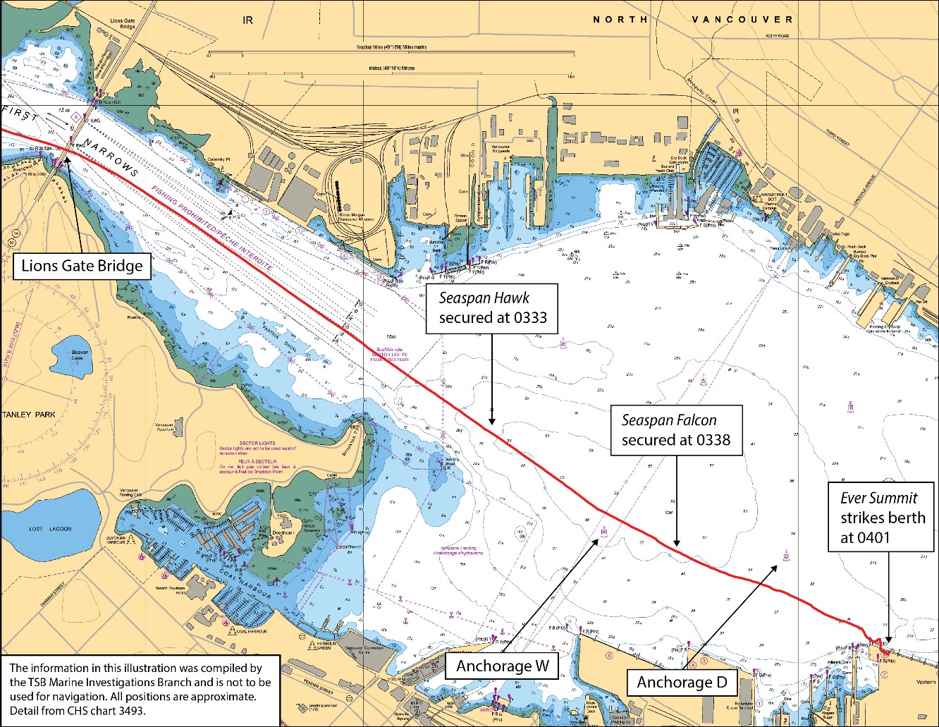 The vessel transited First Narrows at 0321, at which point the vessel’s speed was approximately 8 knots. At approximately 0323, the pilot contacted the assist tugs, Seaspan Falcon and Seaspan Hawk, using his handheld very high frequency (VHF) radiotelephone on channel 17 (the Pacific Pilotage Authority’s working channel). He indicated to the tugs that he would position them alphabetically along the vessel’s port side, securing the Seaspan Falcon forward and the Seaspan Hawk aft.Footnote 15 The Seaspan Hawk was secured aft at about 0333, and the Seaspan Falcon was secured forward at around 0338 while the vessel continued toward Vanterm at a speed of approximately 5 knots (Appendix A). Propulsion control was transferred from the main steering console to the starboard console, and the pilot continued conning the vessel from the starboard side of the bridge.