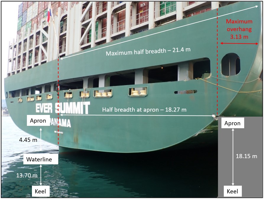 - Height of apron above the keel: 18.15 m (obtained by adding the aft draft to the height of the apron above the waterline)
