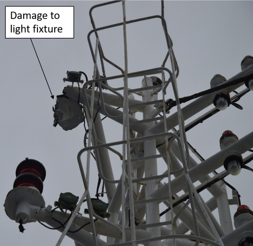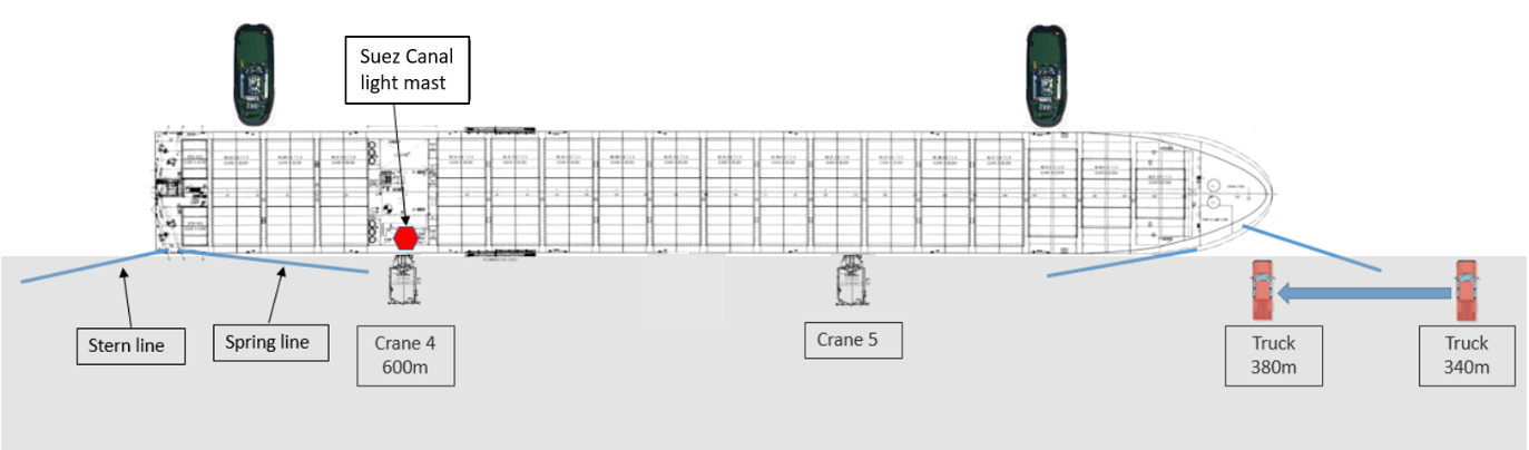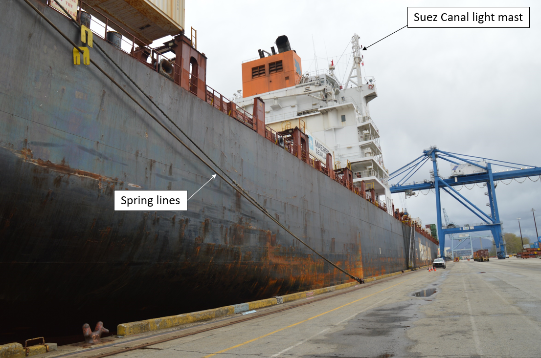 The vessel was manoeuvred alongside the berth with the bow a few metres from the 380 m mark. The 1st line was ashore at 1448. Approximately 2 minutes later, the vessel was slowly moving ahead along the berth during final positioning, at which point one of the light fixtures on the Suez Canal light mast came into contact with the festoon railFootnote 11 on Crane 4.Footnote 12