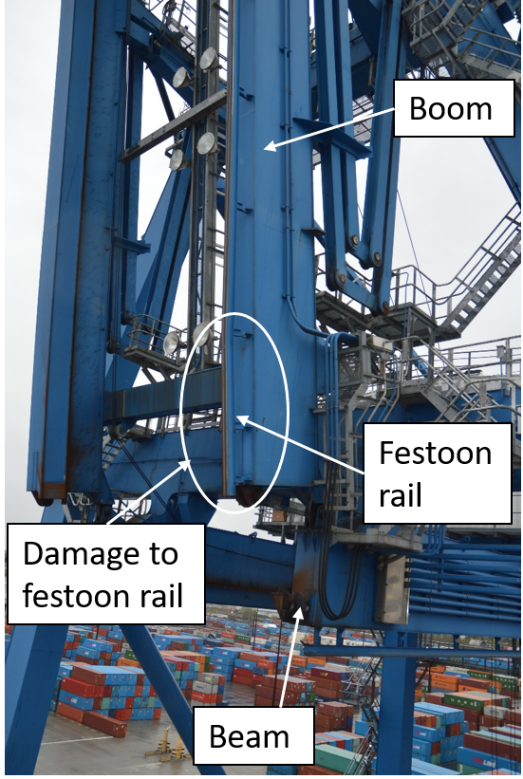The light fixture on the Suez Canal light mast sustained damage as a result of the striking (Figure 2), and the festoon rail on Crane 4 was bent over a distance of approximately 4 m and became misaligned with the horizontal section located under the beam (Figure 3).