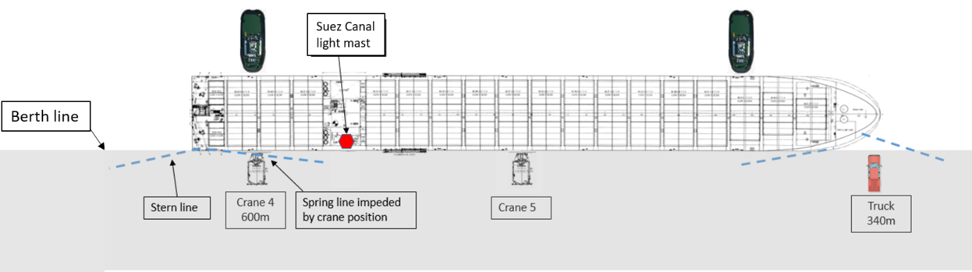 At the time of berthing, it was observed that the position of Crane 4 would impede running the aft spring lines from the vessel to the shore bollards. The head linesman amended the berthing position by 40 m to the 380 m mark to facilitate running the aft spring lines (Figure 5).Footnote 14