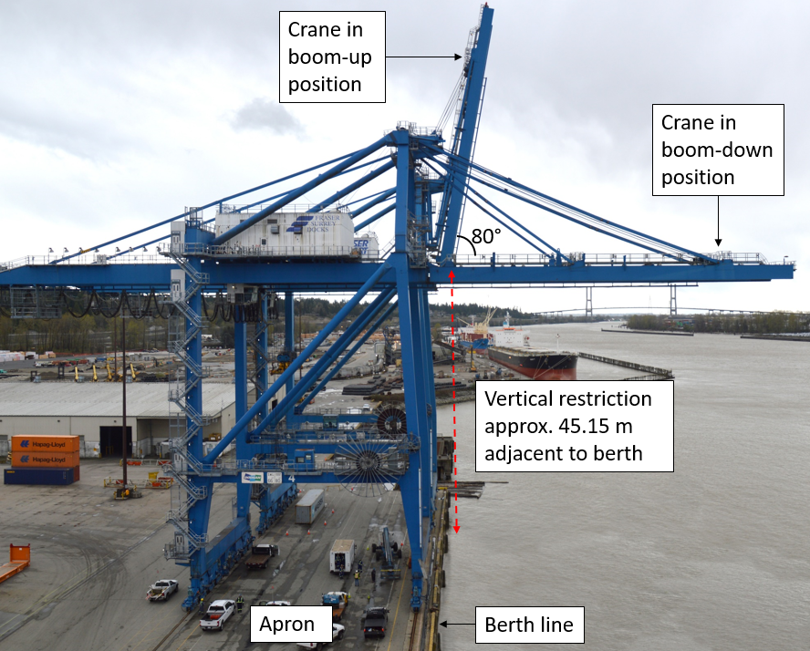 In March 2016, following instances where arriving or departing vessels were faced with a crane in a boom-down position, or the crane was left in a position where it could contact the bow or stern flare of a vessel, the Pacific Pilotage Authority issued a Notice to IndustryFootnote 13 reiterating the need for terminals to keep cranes at the midpoint or as far away from arriving or departing vessels as practicable and in the boom-up position.