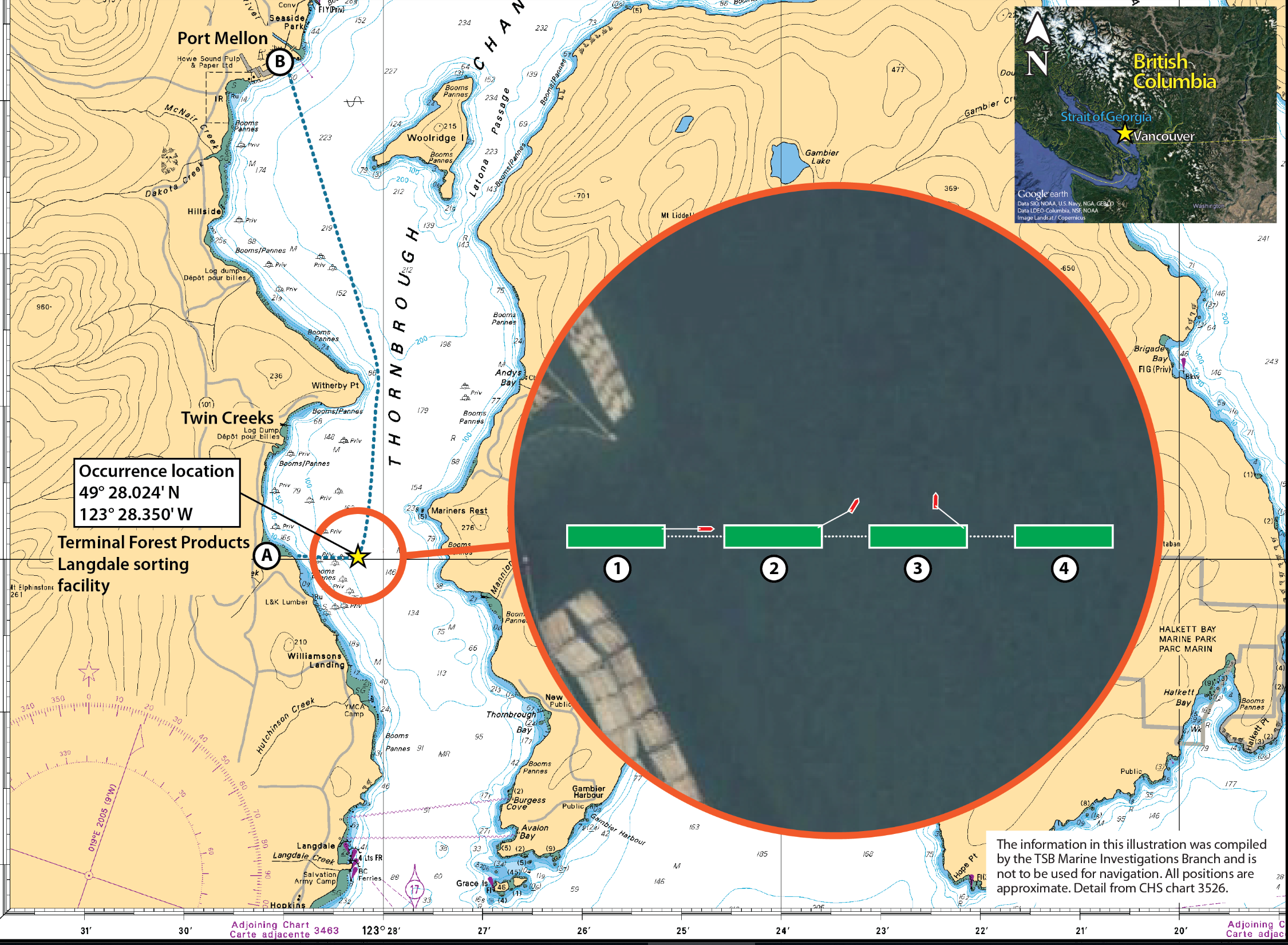 At around 1237, the tug and barge departed the Terminal Forest Products facility at a speed of approximately 2 knots and proceeded about 180 m into the channel. Soon after exiting through the terminal’s safety gate, which consisted of 2 can buoys, the master made a port turn to head north towards Port Mellon. The barge did not respond to the course alteration and the tug began to be girded by the barge and heeled to starboard. The master slowed the speed of the tug, and the tug righted itself.Footnote 1