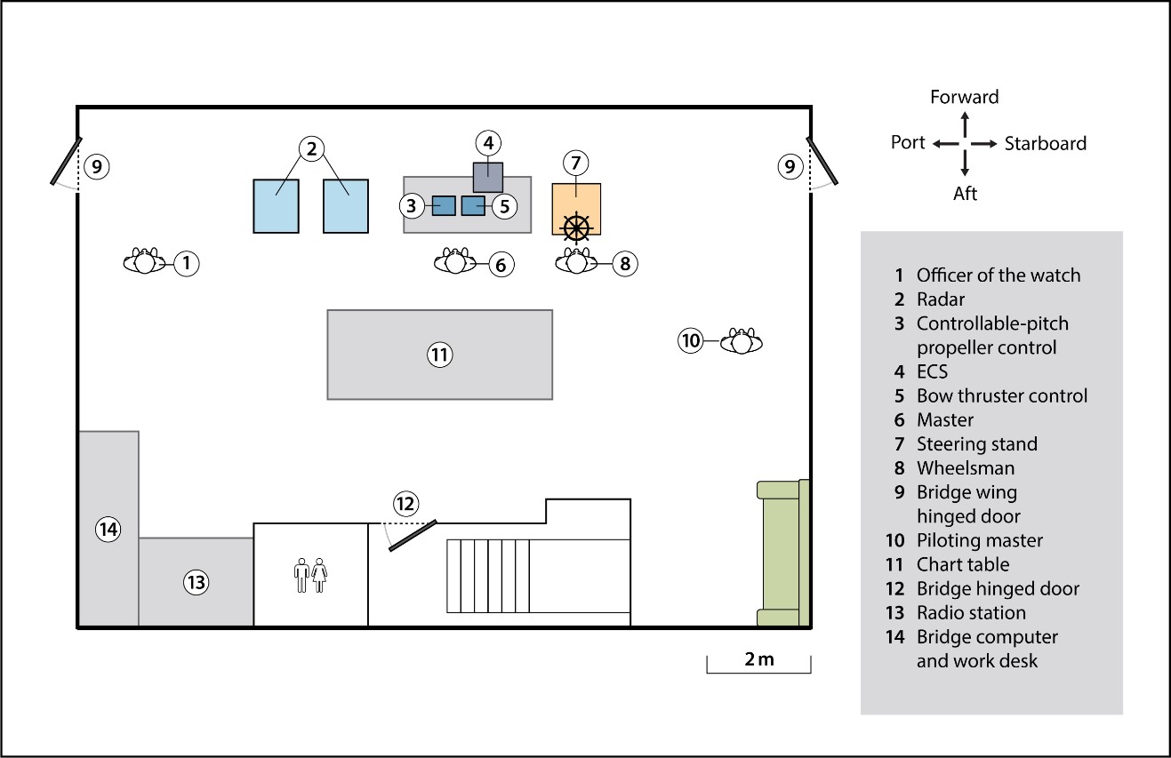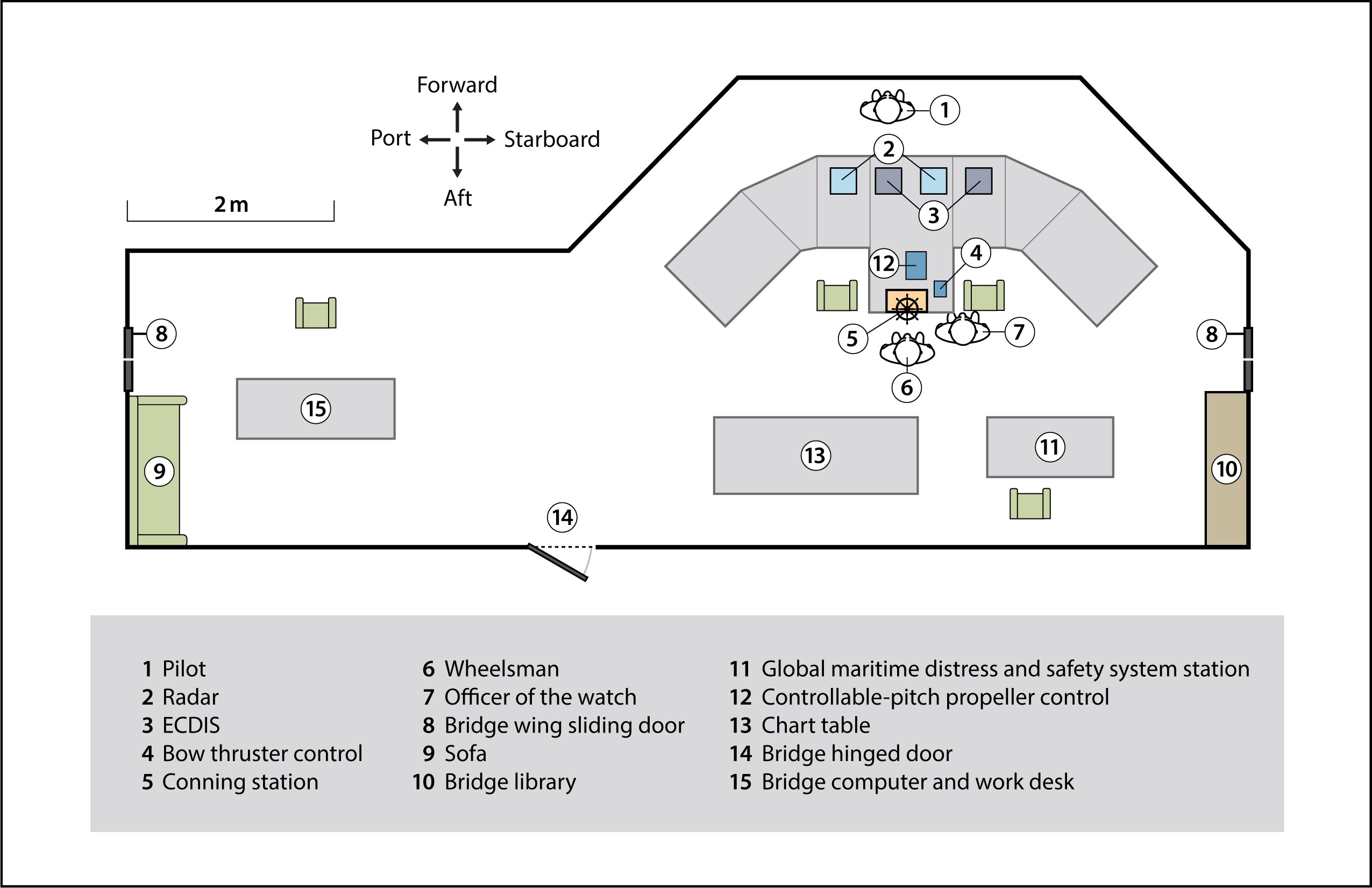 The bridge is equipped with all of the required navigational equipment, including a navigation console that contains the conning station, propulsion controls, 3 cm and 10 cm radars, and an electronic chart display and information system (ECDIS) (Figure 4). The vessel is equipped with a DGPS and an AIS. A voyage data recorder is also installed on board.