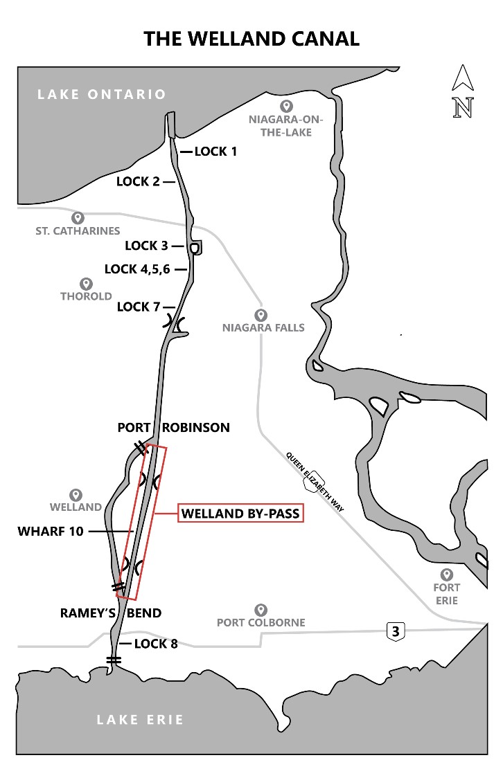 The SLSMC has a handbook that prescribes speed limits for different parts of the Seaway. The speed limit for the Welland Canal is 6 knots, with the exception of the Welland By-Pass, where the speed limit is 8 knots. Footnote 6, Footnote 7 The Welland By-Pass is a relatively straight 13.4 km section of the canal between Port Robinson and Ramey’s Bend (Figure 5). The By-Pass has a navigable width of 106.7 m and a water depth of 9.1 m. Vessels are permitted to meet in the Welland By-Pass.