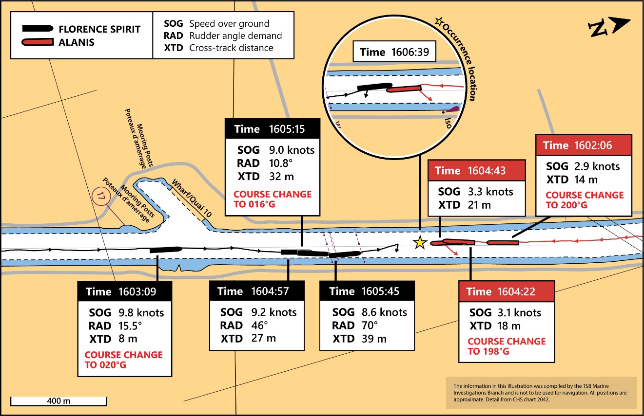 At 1606:30, the master of the Florence Spirit ordered the crew to deploy the anchors and asked the piloting master if full astern should be applied. The piloting master responded affirmatively. The master then set the propeller’s pitch to full astern. At this time, the 2 vessels’ bows were approximately 20 m apart. The Florence Spirit’s speed was 6 knots, and the Alanis’s speed was 3.5 knots. The Florence Spirit continued to sheer to port, crossing over the canal’s centreline into the path of the Alanis.