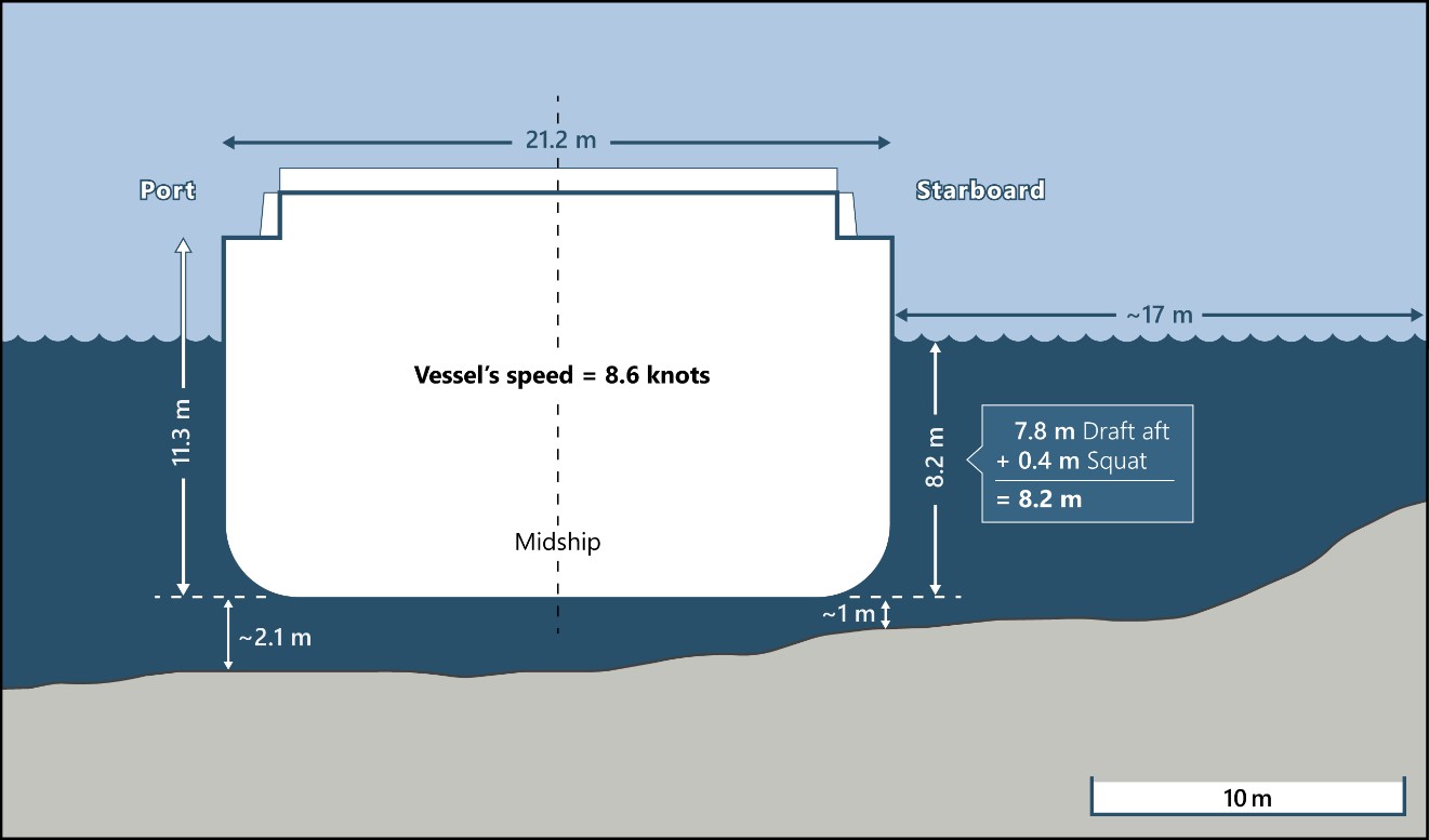 A few seconds later, the piloting master on the Florence Spirit cautioned the wheelsman about the potential for bank suction. Seconds later, the Florence Spirit started to sheer to port (Figure 7).