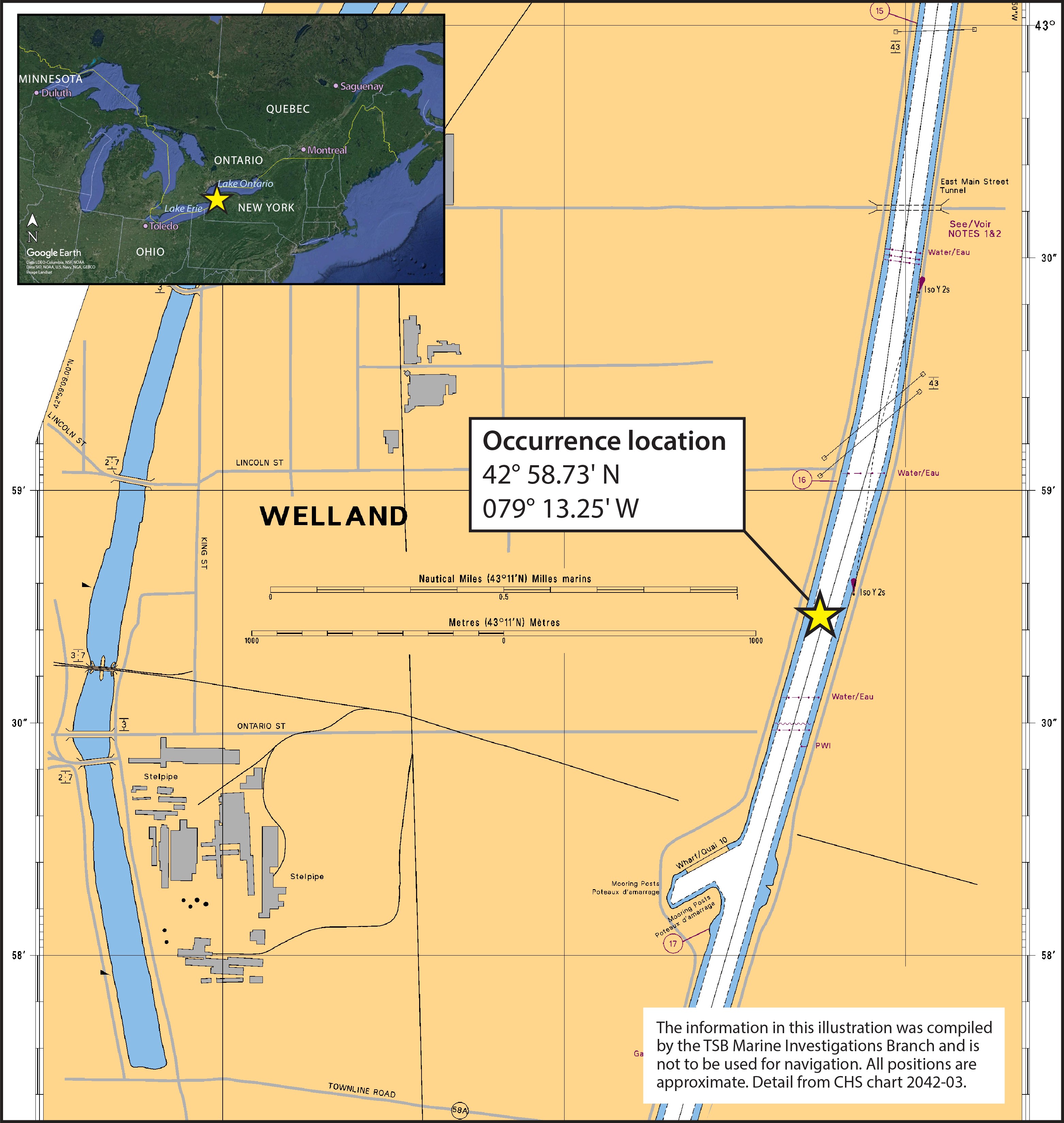 On 09 July 2020, the Alanis departed Montréal, Quebec, Canada, bound for Duluth, Minnesota, U.S. On 11 July at 0055,Footnote 8 the Alanis arrived at Lock 1 of the Welland Canal. Due to a traffic backlogFootnote 9 in the canal, the Alanis remained secured at Lock 1 until 0720, at which time the vessel was able to proceed upbound in the canal. By about 1330, the Alanis was departing from Lock 7. The bridge team on the Alanis at that time consisted of a Great Lakes Pilotage Authority (GLPA) pilot, a wheelsman, and the second officer, who was the officer of the watch.