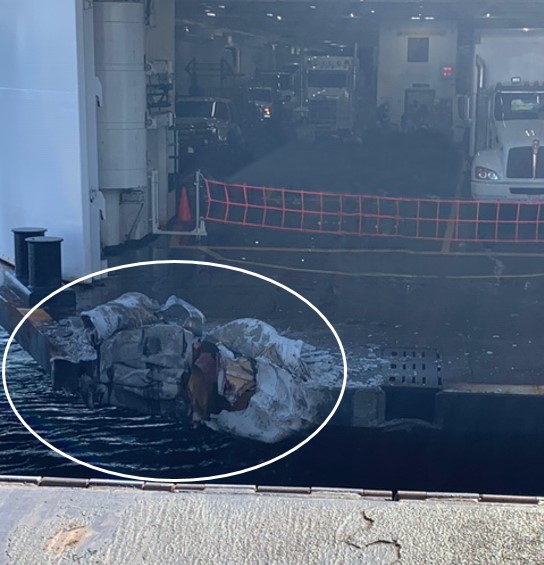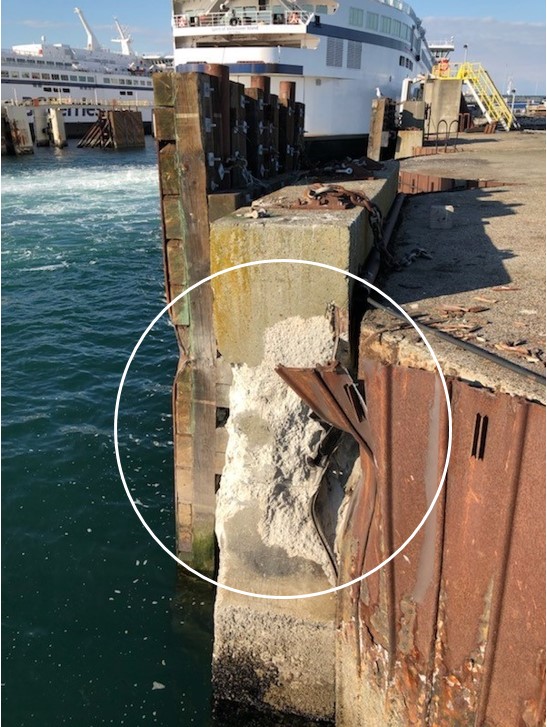 The vessel sustained damage to the deck plate, rubbing strake, and the forepeak tank above the waterline (Figure 2). The concrete abutment of the berth wall was also damaged (Figure 3). The vessel docked at berth 3 at 1637. Vehicles on the upper car deck and foot passengers offloaded at 1802, and the remaining vehicles on the main car deck offloaded at 2058.