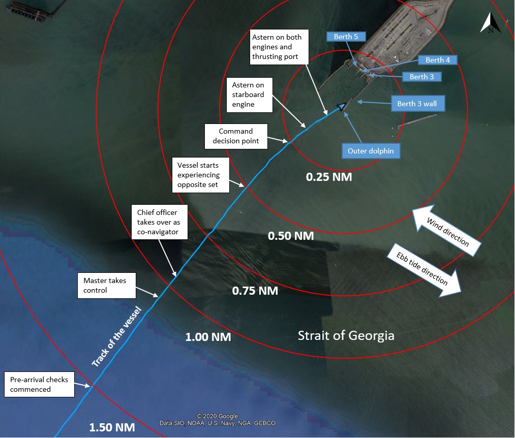 At 1616, as the Spirit of Vancouver Island was approximately 3 nautical miles (NM) off the outer dolphin,Footnote 6 the bridge team notified the master and commenced the pre-arrival checklist. At this time, a deckhand went to the forecastle deck to stand by the anchors. The master arrived on the bridge at 1620 and took control of the vessel. The chief officer assumed the role of co-navigator. At 1622, after briefing the bridge team, the master began reducing the vessel’s speed for arrival. At this time, the vessel was approximately 1 NM off the outer dolphin. The tide was ebbing and the bridge team anticipated that the vessel would setFootnote 7 to the southeast. The winds were from the southeast at 8 to 10 knots.