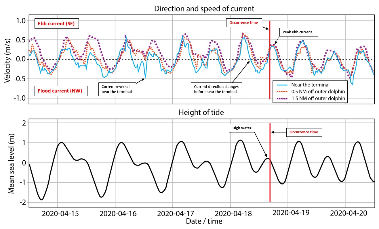 Figure 5 shows the model’s recreations of the direction and speed of the currents (top graph) in correlation with the height of the tide (bottom graph), leading up to the occurrence time. The model showed unexceptional currents at the time of the occurrence; according to the model, the current was at peak ebb and, with currents near the terminal (solid line, top graph) similar to those further out in the channel, there was no current reversal. The current near the terminal generally changes from ebb to flood slightly before the currents farther away (dotted line and line of squares, top graph), but this occurs as the currents are approaching zero (slack tide), not immediately after peak ebb.