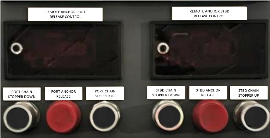 The process to release an anchor remotely involves 2 steps. First, the CHAIN STOPPER UP button, which raises the chain stopper that secures the anchor while at sea, needs to be pressed. Second, the ANCHOR RELEASE button needs to be pressed and held until the anchor releases and the required amount of chain pays out.Footnote 16 There is a delay of 4 to 6 seconds before the anchor starts to deploy, during which the anchor brake is remotely disengaging. At the time of the occurrence, there were no labels or instructions on the control panel to notify operators of this delay.