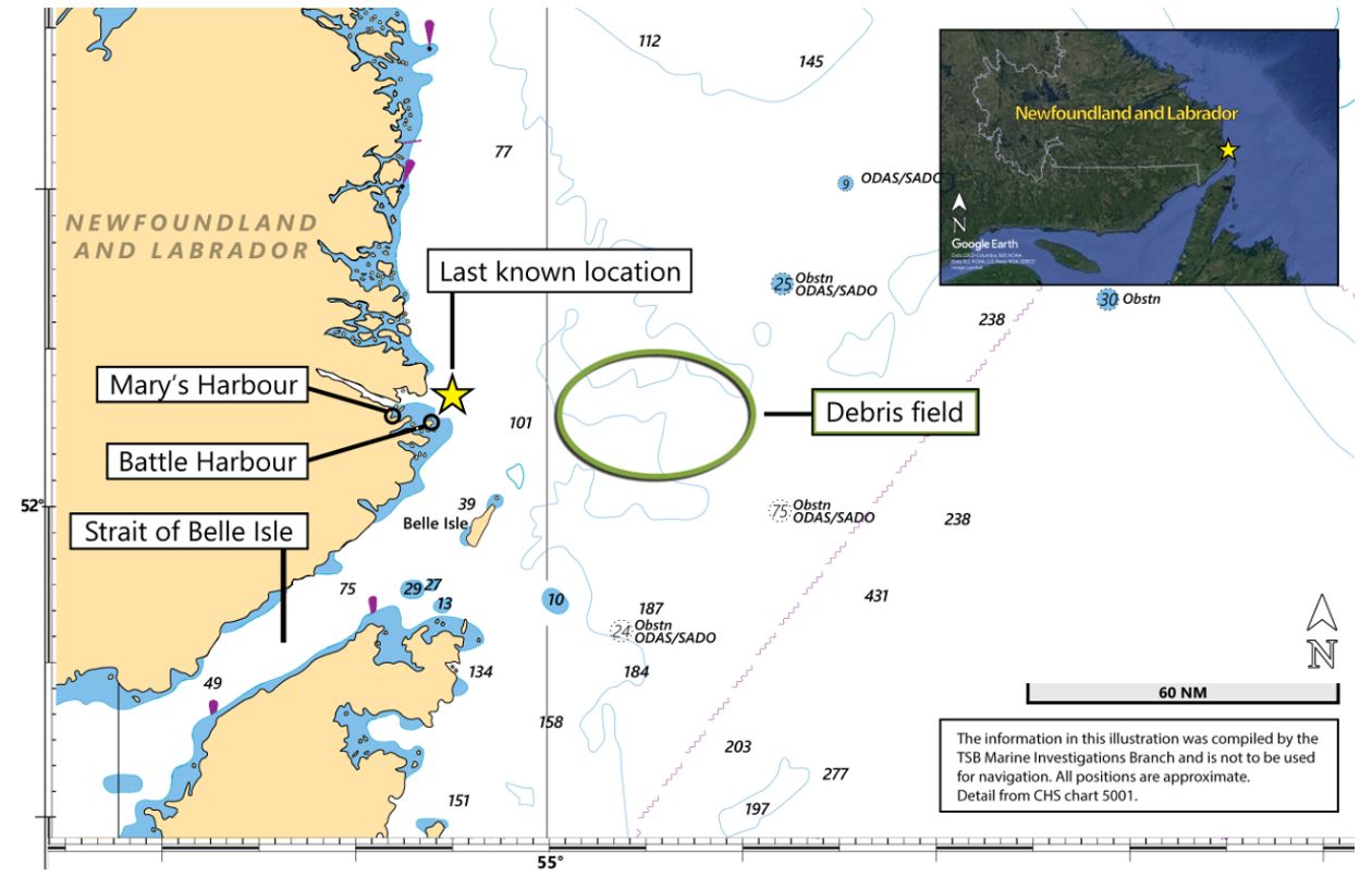 The masterFootnote 2 and one crew memberFootnote 3 departed the fish plant in Mary’s Harbour, Newfoundland and Labrador, at about 0700Footnote 4 on 17 September for the cod fishing grounds (Figure 2). The master’s intentions were to retrieve all of the gillnets and associated catch, ending his 2021 cod fishing operation. When the vessel departed, the winds were variable at 10 to 15 knots, and the morning forecast was for the winds to increase to southwest at 25 knots in the afternoon. The water temperature was reported to be 5 °C.