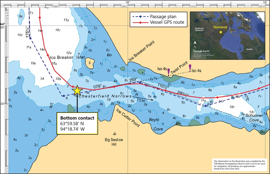 Figure 2. Electronic chart display showing the Kivalliq W’s passage plan, track, and position where the bottom contact occurred (Source: Canadian Hydrographic Service Chart 5625, with TSB annotations)