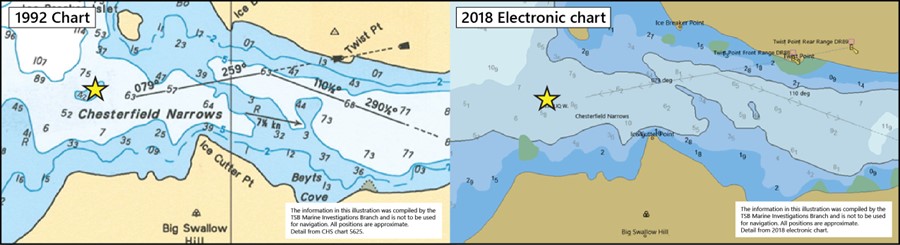 The 1992 edition of Chart 5625 shows a depth of 4.2 m at the occurrence position (Figure 5). The 2018 edition of the chart, which was used in this occurrence, does not show the same shallow depth at this position. Six years elapsed between the hydrographic survey used for the 2018 edition of the chart and the occurrence involving the Kivalliq W.