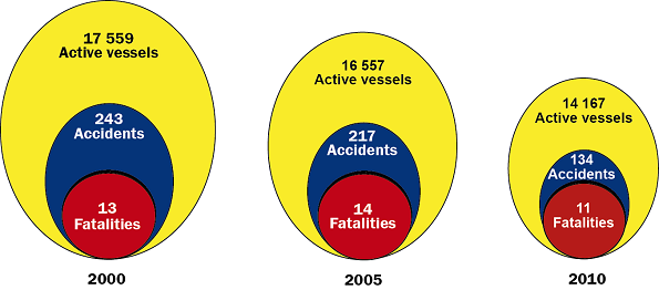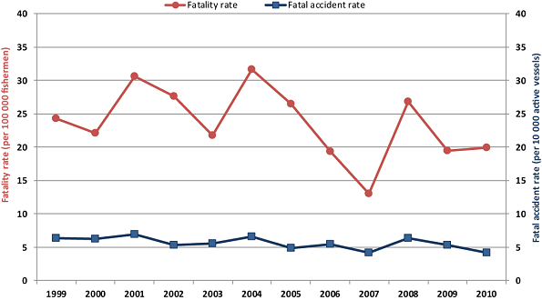 Despite the efforts of the Board and others in government and the private sector, many of the causes of fishing accidents today are the same as those identified by the TSB two decades ago. Most significantly, between 1999 and 2008, an average of 14 people died in fishing accidents each year.