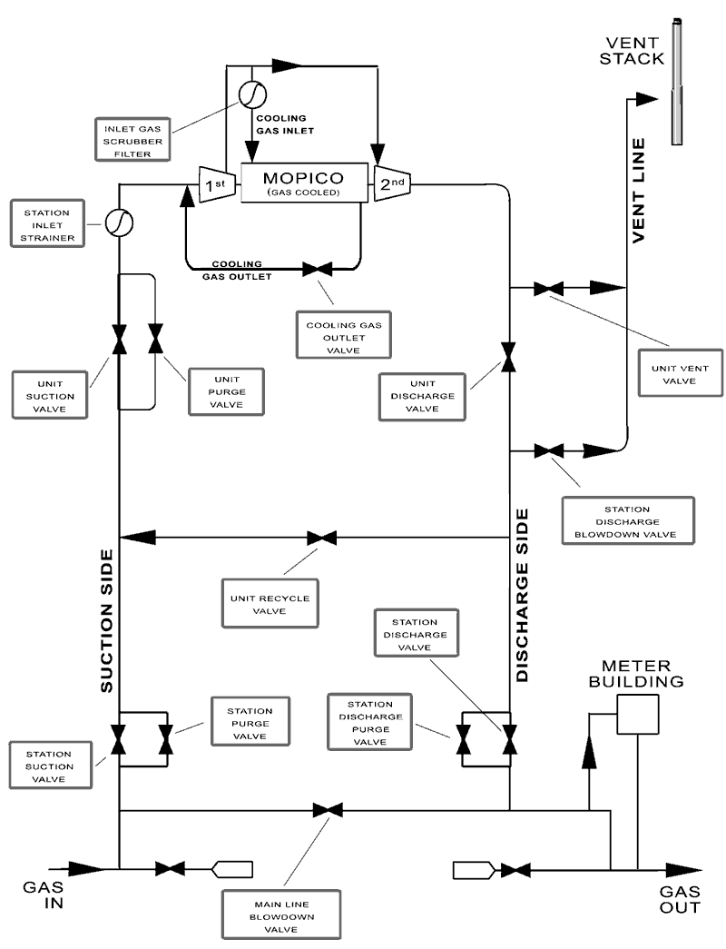 - Emergency unit blowdown (EUBD):the response to an uncontrolled condition at the station, initiated by an operator or an alarm as defined in the station's Shutdown Cause and Effect Matrix. It brings the MOPICO to a full emergency stop by tripping the VFD and then opening the unit vent valves after closing the MOPICO's inlet and outlet valvesto evacuate natural gas in the MOPICO unit piping only; and