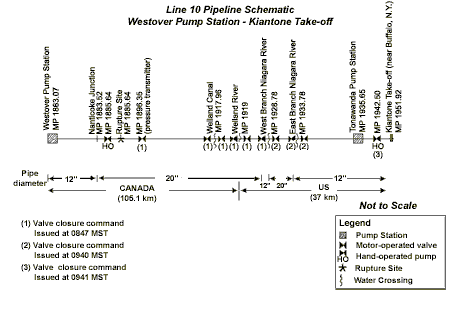 At 0836, the CCO noticed a pressure drop at the pressure transmitter at mile post (MP) 1896, 17 kilometres (km) downstream of the rupture location. Within eight minutes of the failure, the CCO had issued "stop" commands to the pump units at the Westover Pump Station (Westover) and Tonawanda, the stations upstream and downstream, respectively, of MP 1896, and had begun sectionalizing the line between those stations. At 0854, the CCO noticed that the sectionalizing valve at MP 1896 was stuck in travel and requested that the on-call maintenance person check the status of that valve. The on-call maintenance person investigated the pressure abnormalities at Westover and closed hand-operated valves, beginning at Westover. At 1003, the Westover area supervisor located the rupture at MP 1885.64 and took measures to secure the site. The on-call maintenance person was asked to assist with securing the failure site before continuing on to MP 1896. The valve at MP 1896 was handcranked closed at 1117. MP 1896 and locations further downstream are generally at lower elevations than the rupture site, which allowed some draining of the line fill while the valve at MP 1896 remained open. Appendix A shows a schematic of Line 10.