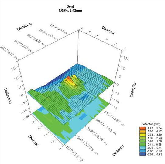The MFL tool used in 2004 was capable of detecting dents, wrinkles and buckles, in addition to detecting internal and external metal loss. However, this tool could not provide a direct measurement of deflection. During the 2004 inspection, the MFL tool detected the dent, but did not identify the gouging, as the gouge depth of 0.4 mm was below the detection capability of the tool.