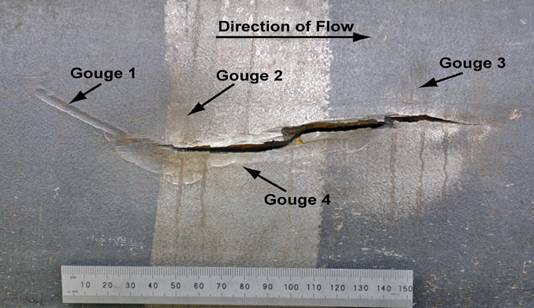 - The leak occurred at a 160 mm long crack associated with a dent and gouge located at the 6 o'clock position on the pipe. The maximum depth of the dent was 3.1 mm (0.51 per cent of the pipe diameter).