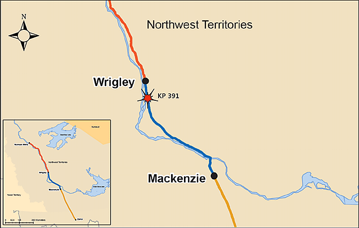 Line 21 consists of approximately 869 km of pipe with an outside diameter of 323.9 mm and varying wall thicknesses. This pipeline was being used to transport sweet crude oil from Norman Wells, Northwest Territories, to Zama, Alberta. It has intermediate pump stations at Wrigley and Mackenzie, both in the Northwest Territories, and an injection site in Alberta. The pipeline is operated remotely through Enbridge's control centre in Edmonton, Alberta.