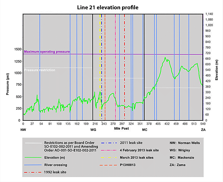 Figure 2 provides a graphical presentation of Line 21 (Norman Wells to Zama), including the elevation, maximum operating pressure, pressure restrictions imposed by NEB, and locations of the recent (i.e., 2011 to 2013) pipe sections with contaminated soil.