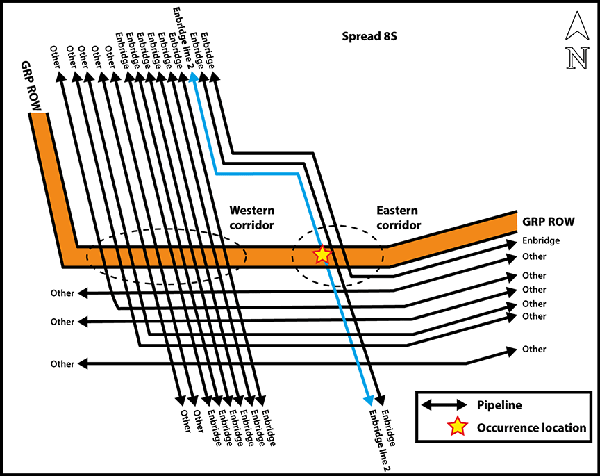 As part of the GRP construction plan for the spread 8S corridor, crossing agreements were developed with the owner of each foreign utility to be crossed. For the spread 8S corridor, 8 federally regulated Enbridge pipelines were to be crossed during the installation of the NPS 20 and NPS 36 pipelines. For these 8 pipelines (including the Line 2 pipeline), 2 crossing agreements between GRP Ltd. and Enbridge had been developed. These crossing agreements included the following:
