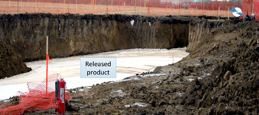 The initial emergency response focused on preventing the released product from igniting. Fire-retardant foam was applied throughout the occurrence site. The cleanup was then focused on recovering the released product.