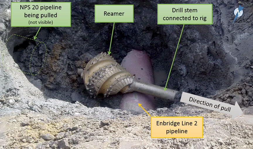 - The accident occurred when the nominal pipe size (NPS) 20 pipe for the Grand Rapids Pipeline (GRP) project was being pulled through a horizontal borehole and the attached reamer struck and punctured Enbridge Pipelines Inc.'s Line 2 pipeline.