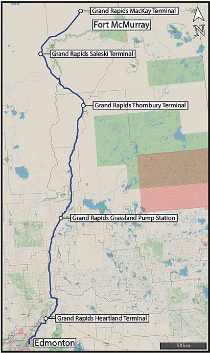 An NPS 36 crude oil pipeline will move blended bitumen from northwest of Fort McMurray to the Edmonton market, and an NPS 20 pipeline will move diluent from Edmonton to northwest of Fort McMurray.