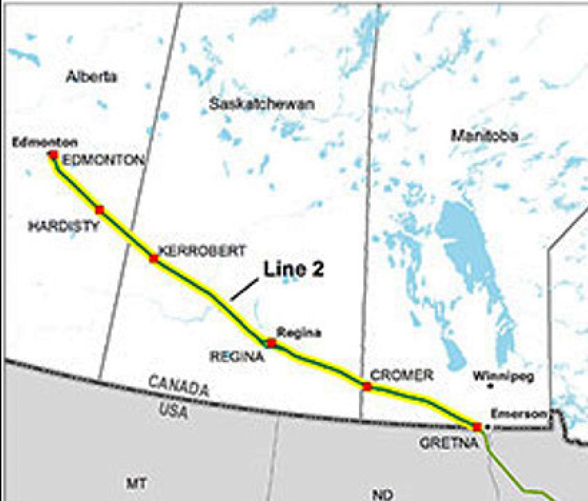Enbridge's Line 2 pipeline, a federally regulated pipeline, originates in Edmonton, Alberta, and extends east through Saskatchewan and into Manitoba to the Canada–United States border. Near Gretna, Manitoba, the pipeline interconnects with Enbridge's Lakehead System in the United States (Figure 9).