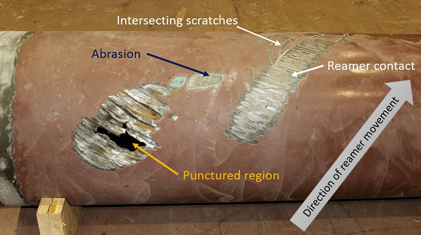 - The damage in the region of the reamer contact had no through-wall holes. The pattern and profile of the intersecting scratches indicated that the rotating reamer was moving toward the west, in the direction of the pull.