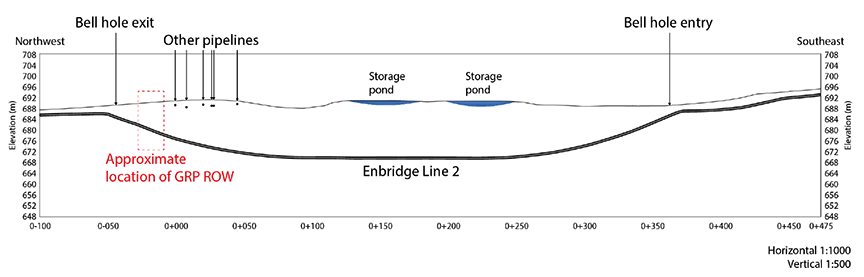- When the crossing agreements were being developed, GRP Ltd. had requested the profile drawings from Enbridge to design each of the crossings. However, only an approximate depth (11.3 m) for the entire GRP right of way (ROW) was provided. With this single data point, GRP Ltd. was not specifically aware of the slope of the Line 2 pipeline within the ROW.
