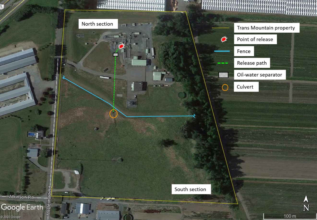 After the source of the release was isolated, Trans Mountain placed vacuum trucks at the oil-water separator and along the fence line separating the north and south sections of the property to prevent further product migration into the agricultural field by capturing the oil before it could reach it.