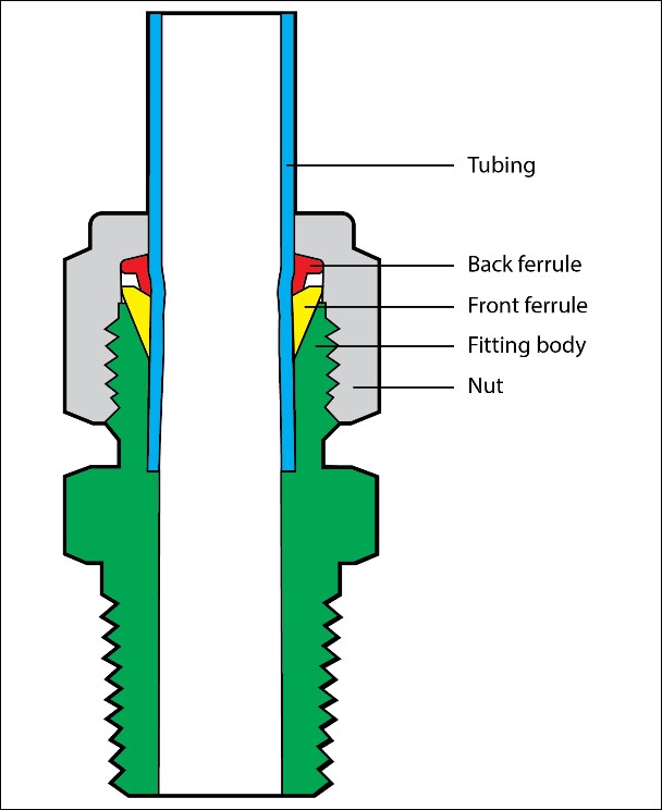 Installation consists of fully inserting a tube into the bottom of the fitting and turning the nut. As the nut turns, the double-ferrule design creates a seal between the fitting body and the tubing, while also compressing against the tubing to ensure that the fitting is tight. The manufacturer's installation instructions for this type of compression fitting specify a 1¼ turn on the nut after finger tightening.