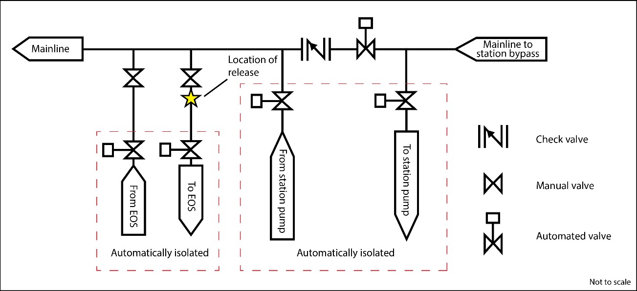 When the combustible gas reached its lower explosive limit of 20% in the pump building, an ESD of the Sumas Pump Station was automatically initiated. In an ESD, the relevant valves are automatically set to allow the flow from the mainline to bypass the station and, once set, they are locked into position.Footnote 9