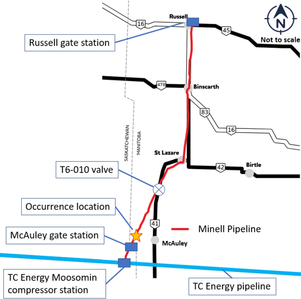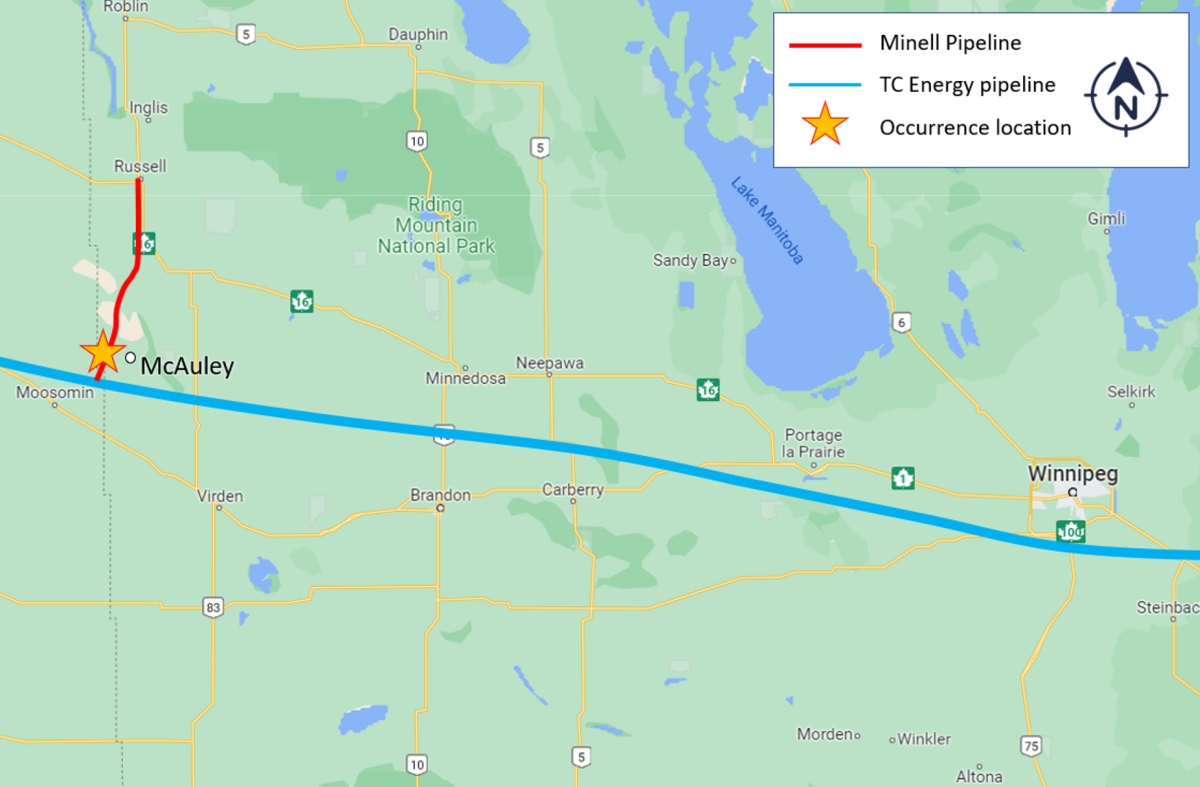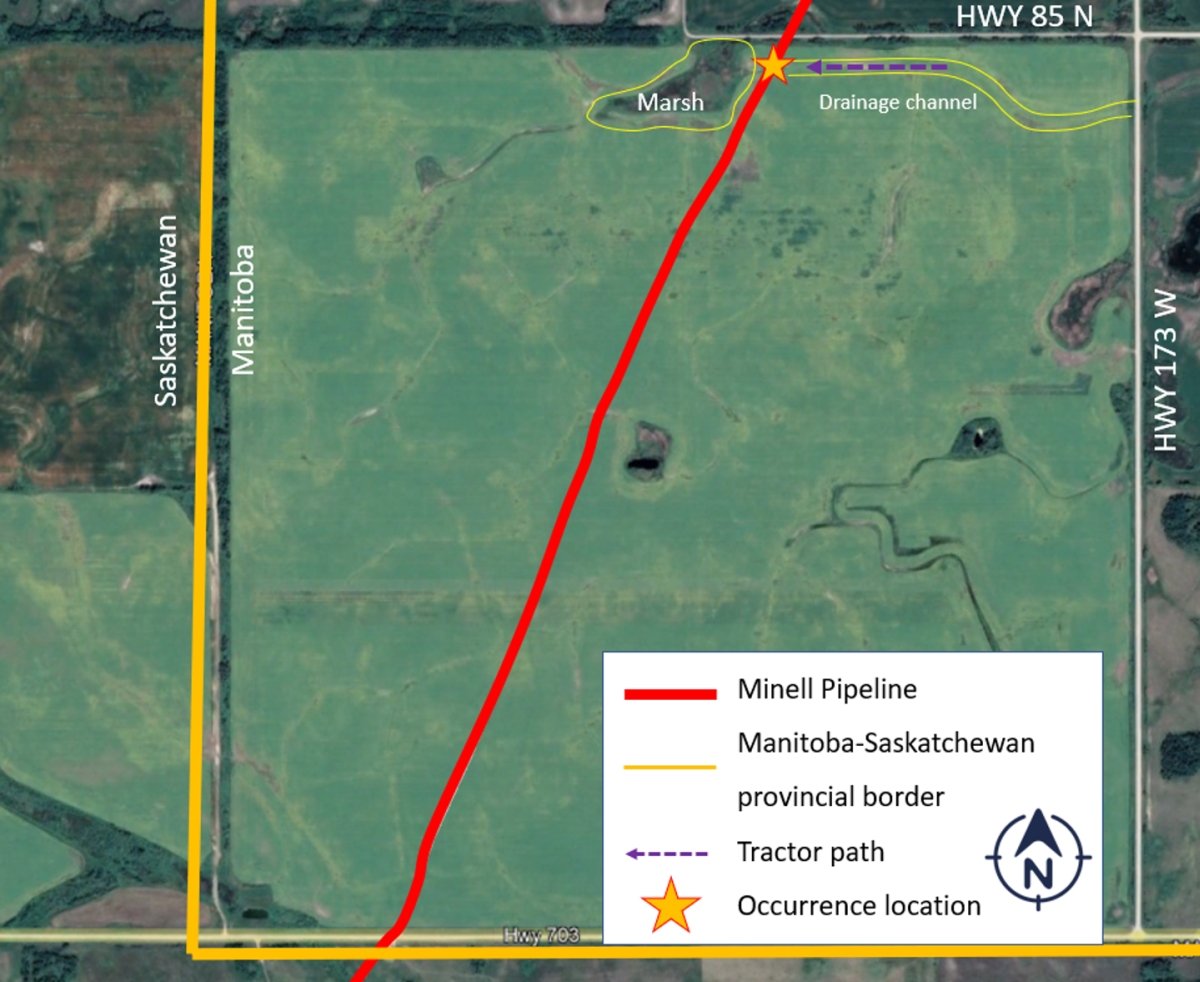 The occurrence took place in a rural area in southwestern Manitoba near the border with Saskatchewan. The pipe was struck in an agricultural field near the Minell Pipeline’s delivery point from TC Energy’s Canadian Mainline (Figure 1). Pipelines from both Manitoba Hydro and TC Energy cross agricultural property owned by the landowner.
