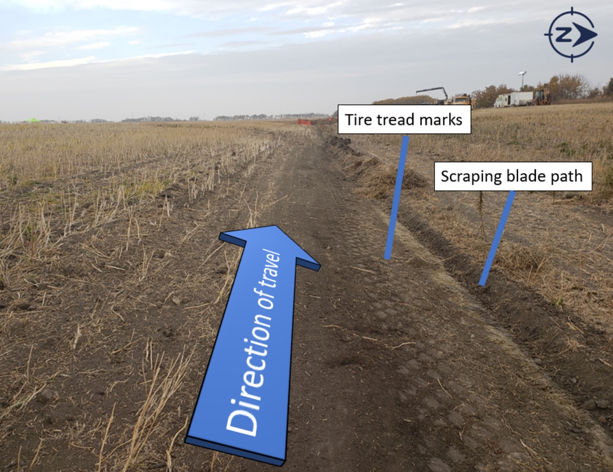 In the vicinity of the occurrence, the land was mostly flat and there were remnants of harvested canola stalks at ground level.Footnote 8 The path of the tractor and ground-scraping blade was indicated by tire tread marks and by disturbed soil where the blade had scraped the surface (Figure 3). The ground scraping followed the path of the drainage channel west toward and across the pipeline, parallel to Road 85 N.