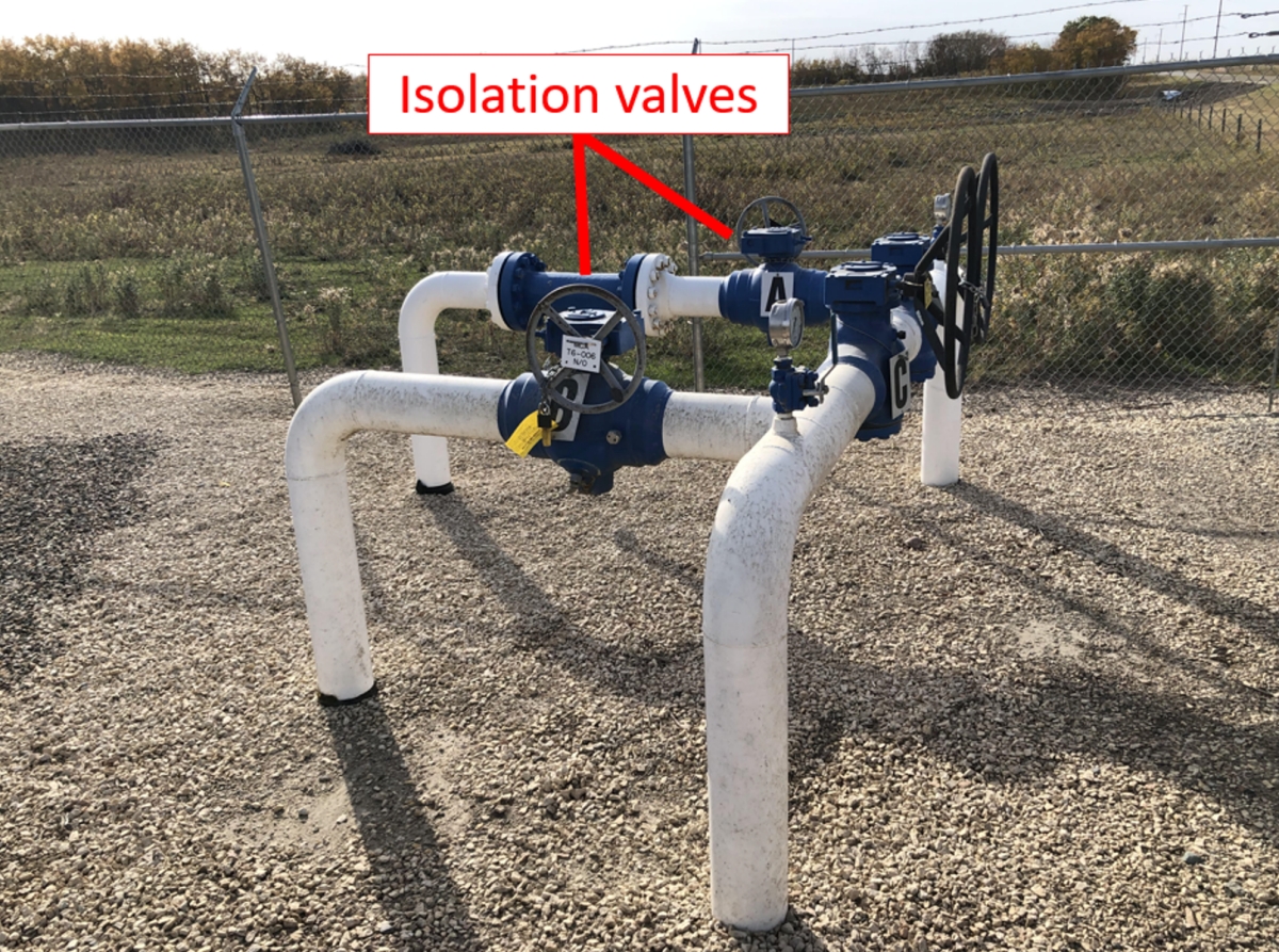 The gate station is fenced; within the yard area, there is a set of above-ground valves used to bypass or isolate the station (Figure 7). The valves are nominal 6-inch ball valves and are operated manually. The McAuley gate station is not staffed, and the nearest Manitoba Hydro staff are based in either Russell or Virden, each approximately 70 km away by road.