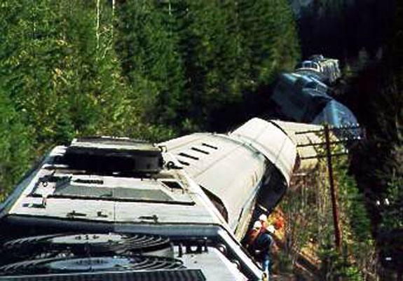 The train came to a stop with the second (trailing) locomotive and all cars derailed. The baggage car, situated immediately behind the locomotives, and the second to sixth cars were leaning at various angles toward the North Thompson River, situated approximately 30 m (99 feet) to the east, and about 10 m (33 feet) below the tracks. The remaining cars (7th to 13th) were derailed and upright on the roadbed. Detraining in the direction of the river was impractical due to the steepness of the embankment.