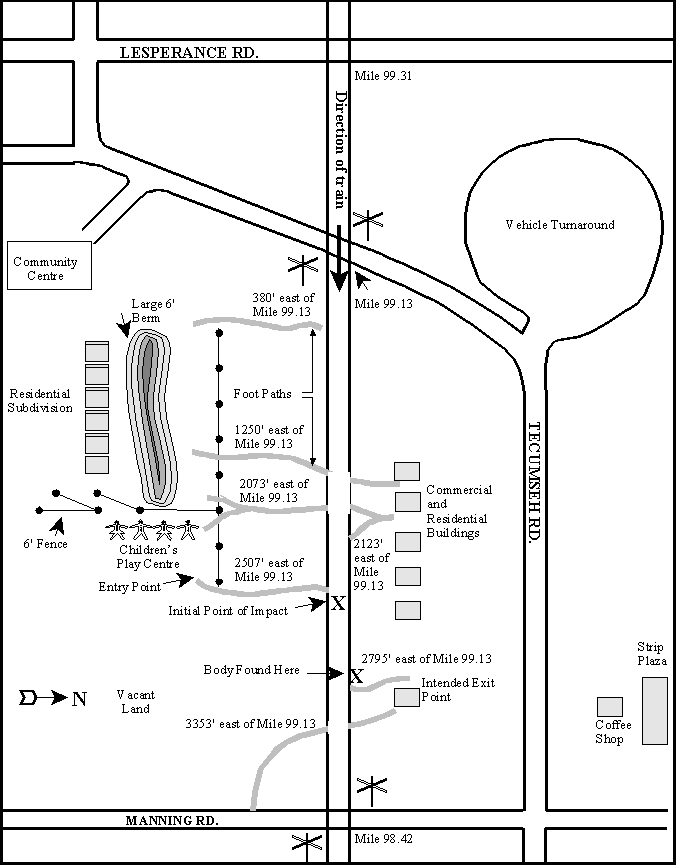 A residential subdivision was under construction on the south side of the main track, approximately 380 feet east of the Tecumseh Road crossing. A six-foot chain-link fence began at this point and extended east for 2,125 feet, separating the railway right-of-way from the residential land and a community park and outdoor playground that was just east of the neighbourhood. The fence had been previously cut through at one location, and holes had been dug under it at two other locations. A berm had been constructed south of the fence to act as a visual and auditory barrier between the railway right-of-way and the houses. At the east end of the fence, a well-worn path led from the playground to the main track. The two pedestrians walked through the playground and entered the railway right-of-way at this location. Further east, a distance of 285 feet, another well-worn path led north to privately owned property and a cluster of commercial outlets. This was the intended exit path of the two pedestrians. From the east end of the chain-link fence eastward to Manning Road, access to the railway right-of-way was unrestricted. The land was vacant and zoned residential. Immediately adjacent to the track, there was a swampy ditch with considerable underbrush extending to the Manning Road crossing.