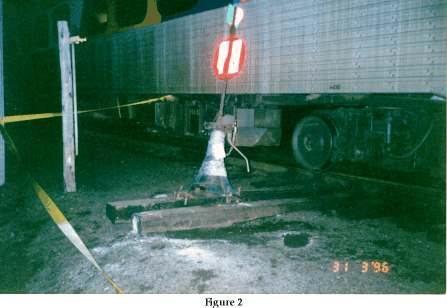 The switch was canted over at approximately 20 degrees from vertical. There were tire tracks from the gravel road stopping at the switch stand. There were scuff marks on the switch stand approximately 14 inches (36 cm) from the base of the stand and particles of white paint were imbedded in the scuff marks. The switch stand securing spikes were loose and the anchoring ties were dislodged (Figure 2). The switch was lined for the normal position and the switch target was in place and properly indicated that the switch was lined for the main track. An examination of the switch revealed that the components were in good condition, properly adjusted and well maintained. The force required to dislodge the switch stand was considerable. The person(s) responsible should have been aware of the impact, as damage to the vehicle would have been significant.