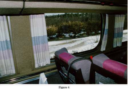 Five of the emergency exit windows in the first coach had their rubber gaskets partially or completely removed; however, the window panels were still in place. One of the five windows had been struck from the inside and cracked, and two had been loosened from their securement. One of the windows, with the gasket completely removed, was of the non-emergency window type with no lift-out handle. This window was still tightly in place. Some reclining seat backs were found to have partially obstructed direct access to the window handles (Figure 4). The rearmost emergency window (south side) was partially obstructed by a baggage containment area (Figure 5).