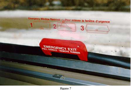 The coaches are equipped with 12 emergency escape windows located every second window (the kitchen car is slightly different with only eight emergency windows). These windows consist of two 1/4 inch (6 mm) panes of safety glass. They measure 31 inches (78.74 cm) high by 50 inches (127 cm) wide and weigh approximately 59 pounds (26.8 kg). The sills are approximately 34 inches (86 cm) from the floor. A non-illuminated three-part pictogram on the window, above the handle, illustrates its operation (it was noted that two of the emergency windows in coach 611 did not have a pictogram). Each emergency window is identified by a large red handle with the words "Emergency Exit / Pull Handle - Remove Rubber." The gasket is to be removed by pulling on the handle. A second handle, fixed to the window and exposed by pulling the first handle away, is to be pulled and the window is designed to swing inward as though on hinges at the top (according to the pictogram), toward the interior of the coach (Figure 7).